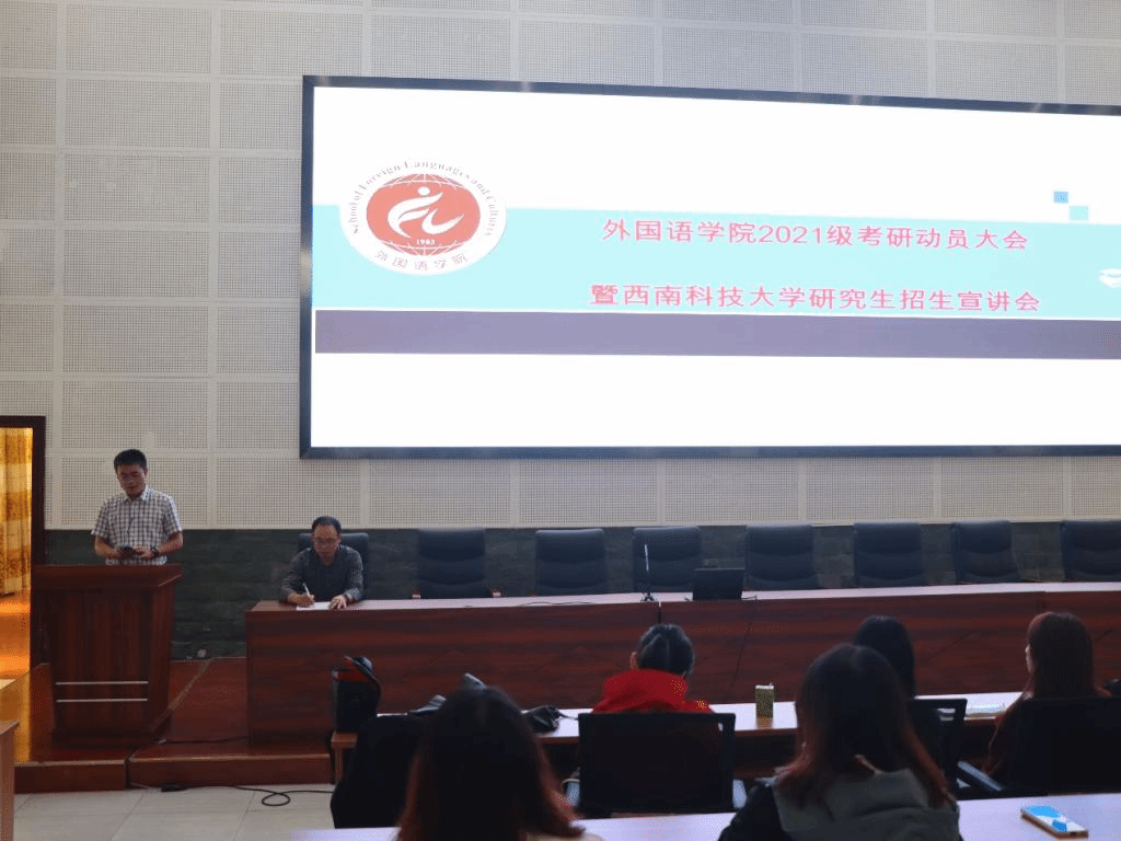 10月12日上午,304永利集团2021级考研动员大会暨西南科技大学研究生招生宣讲会于本部图书馆二楼学术报告厅举行。出席本次活动的有西南科技大学翻译硕士教育中心主任范先明博士、公司英语专业教研室主任韦丽老师和2021级辅导员彭勇老师,2021级全体员工参与了此次大会,会议由公司党委副书记李翔主持。