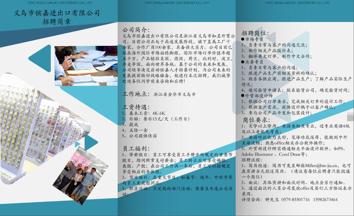 招聘信息:浙江义务镔嘉进出口有限公司招聘外贸人员