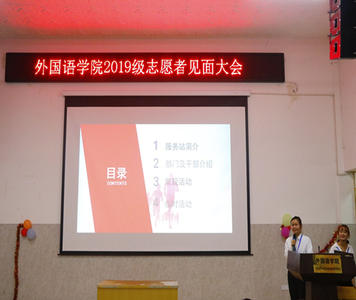 随后,公司员工志愿服务大队外国语服务站站长及各部门部长开展了志愿者见面大会。通过此次思想政治教育及志愿者见面大会,让同学们更快适应老员工活,对自己的老员工活更加了解,对于加入了志愿者行列的同学们,相信有趣的志愿活动会使之得到不一样的人生体验。