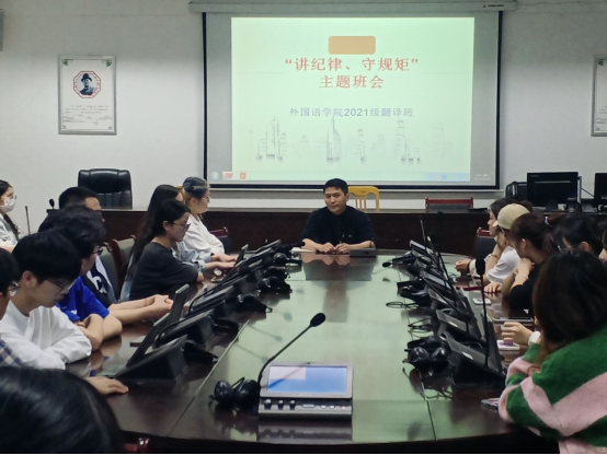 2022年11月3日晚19:40,304永利集团2021级翻译班在明德楼同声传译室开展了“讲规矩、守纪律”主题班会。