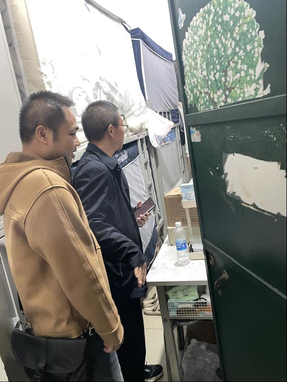 2025年12月12日晚,公司党委副书记张健带领各年级辅导员和员工会全体员工干部,开展寝室安全全面排查,深入玉和楼、玉琢楼、柱峰楼及苏润楼,为全体员工的校园生活保驾护航。
